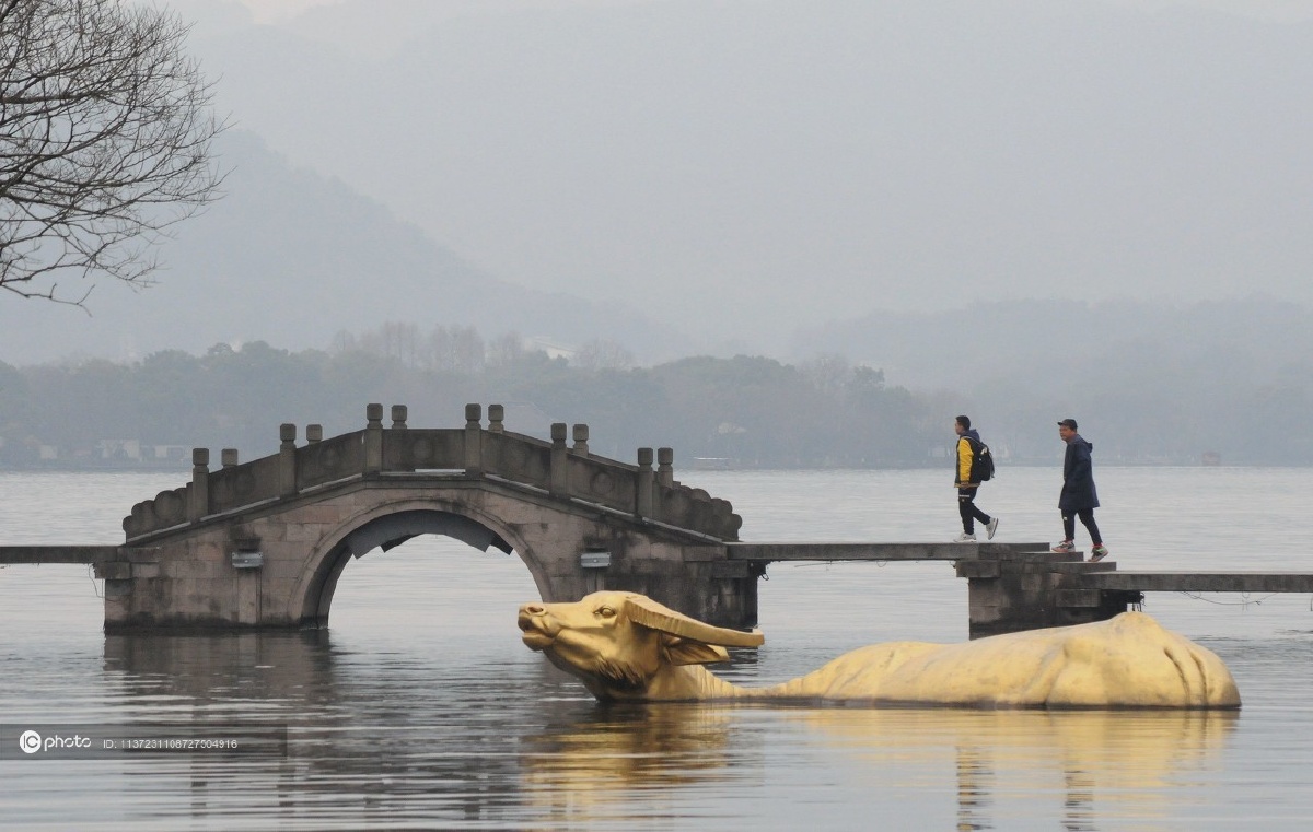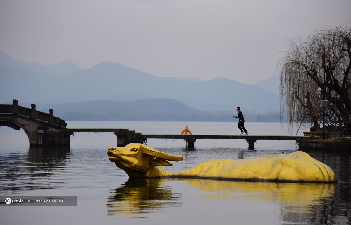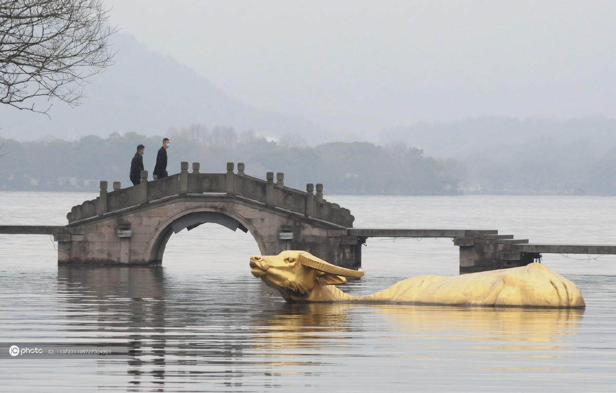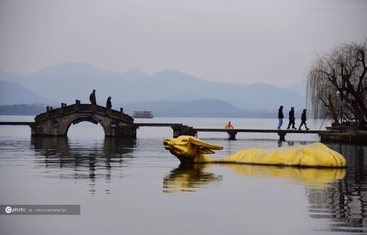 杭州西湖天地涌金池里的“大金牛”,是大家最熟悉不过的景点之一。因为马上就要到农历牛年春节,“大金牛”每12年一轮又将“火”一把,成为新年里市民游客最爱的打卡点之一。大家都想着能和金牛合张影,新年沾点牛气。“大金牛”是一件名为“金牛出水”的雕塑作品,表面是一层金色镀铜,在阳光下金灿灿的,非常夺目。它的背后有一个民间传说故事。相传在汉代,在西湖底部有金牛潜伏,每逢湖水干涸之时,金牛即涌现,吐水将湖注满,让周边的老百姓有水喝,有水灌溉农作物。当地官吏为了讨好皇上欢心,命百姓车干湖水。水干之时果见金牛,官吏们争先恐后下湖捉牛,金牛昂首怒吼,张嘴吐水,顷刻之间,官吏们全部被淹没。从那以后西湖水不再干涸,金牛也不再出现了。因此,西湖也被称作“金牛湖”。 2002年,西湖综合保护工程启动,一批充满西湖文化元素的雕塑陆续出现在了西湖边,其中就包括了这头《金牛出水》。 连国庆/IC photo